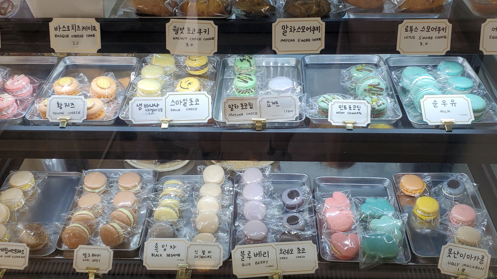 멜팅(Melting)은 생각보다 마카롱 종류가 많았는데요. 마카롱만 대략 20 종류에 맨 위칸은 빵을 판매하고 있더군요. 저희는 마카롱만 구매할려고 와서 그냥 마카롱만 10개 골라서 주문했어요. 주문하고 결제를 하니까 사장님이 서비스로 작은 빵 하나 주시더군요.