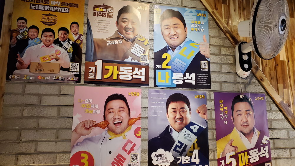 가게 윈 쪽 테이블에 앉아서 벽 쪽을 보니 마동석이 광고하는 전단지를 볼 수가 있네요. 보면서도 좀 웃었습니다.