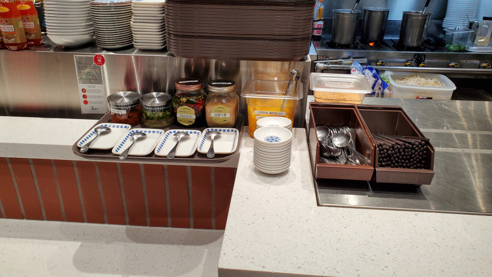 음식점 앞에는 식기와 밑반찬을 볼 수가 있는데요. 저는 개인적으로 땅콩가루를 뿌려서 먹기 때문에 땅콩 가루만 제가 앉은 테이블로 가지고 왔습니다.