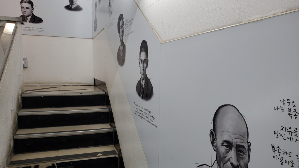 오랜만에 지하로 내려가는 서점을 보니까 반갑네요. 역시나 계단 주변에는 다양한 인물들의 말씀과 사진들을 볼 수가 있어요.