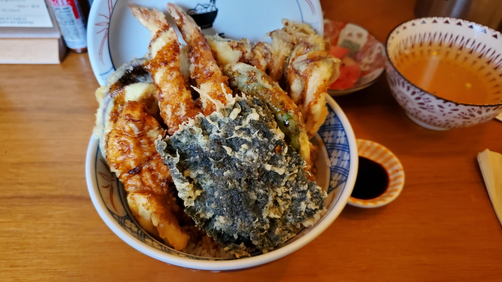 제가 주문한 고쿠텐동 (11.0)이 나왔네요. 일단 첫 감상평을 이야기하면 정말로 맛있게 보입니다. 튀김에는 소스가 뿌려져서 나오는데요. 생각보다 특이하더군요.