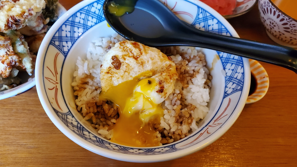 일단 안내 내용과 같이 튀김을 그릇 뚜껑에 덜어놓고 온천 계란과 밥을 함께 비볐습니다. 그리고 튀김을 타레소스와 먹었습니다. 시치미나 고추냉이 같은 경우는 제 취향이 아니기 때문에 따로 얹어서 먹지는 않았어요.