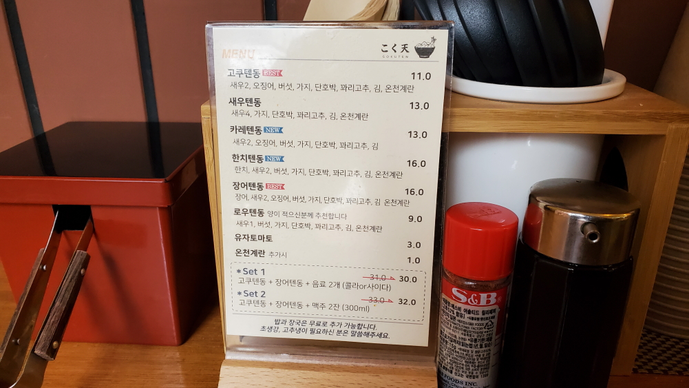 테이블 앞에는 메뉴판과 어떻게 고쿠텐 (Gokuten) 텐동을 더욱 맛있게 먹는 방법을 알려주는 안내 종이가 있는데요. 저는 일단 장어를 좋아하지 않기 때문에 이 가게에서 베스트 메뉴인 고쿠텐동 (11.0)을 주문했습니다. 튀김 같은 경우는 따로 추가가 가능하지만 따로 추가를 하지 않았습니다.
