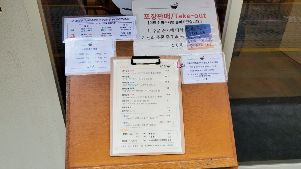고쿠텐 (Gokuten) 산본점은 역에서 중심상가 쪽으로 내려오면서 왼쪽 골목에 위치해 있는데요. 아쉽게도 쉽게 보이는 위치가 아니라서 조금 걸어야 합니다. 고쿠텐 (Gokuten) 가게는 상시 열지 않고 점심과 저녁에 오픈을 하는데요. 아쉽게도 중간에 브레이크 타임이 있어서 시간을 잘 보고 오셔야 합니다. 가게 앞에는 이렇게 Take-Out을 할 수 있다는 안내표와 메뉴판을 볼 수가 있으니 한번 보는 것도 나쁘지 않죠?