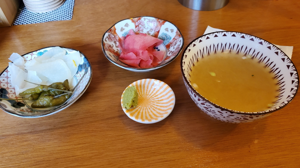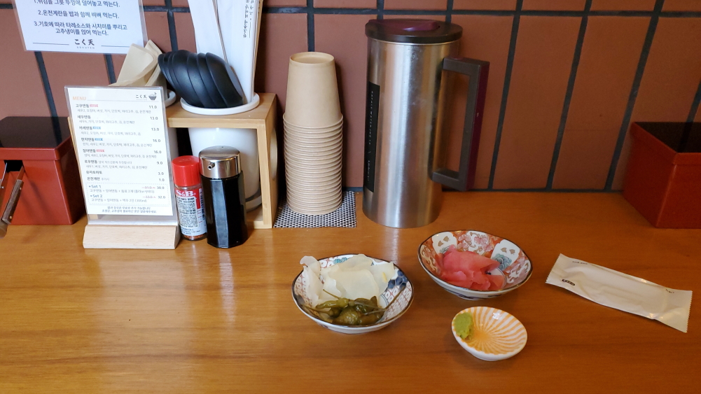 내부 인테리어는 아쉽게도 사람들이 많아서 촬영을 하지 못했는데요. 가게에는 혼자 오는 사람들을 위한 테이블도 있고 2~3명 정도 오는 손님들의 테이블도 있습니다. 물론 저는 혼자서 방문을 했기 때문에 바 형식의 테이블에 앉았습니다. 앉으면 이렇게 2가지 반찬과 고추냉이를 주는데요. 이름은 모릅니다! ㅎㅎ