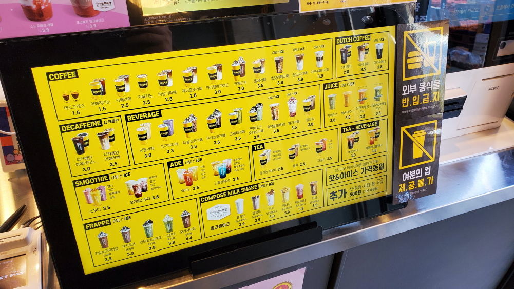 매장 안에 들어가면 이렇게 메뉴들을 볼 수가 있는데요. 가격을 보면 확실히 다른 브랜드에 비해서 저렴하다는 걸 느낄 수 있네요. 저는 아인슈페너를 주문했습니다.